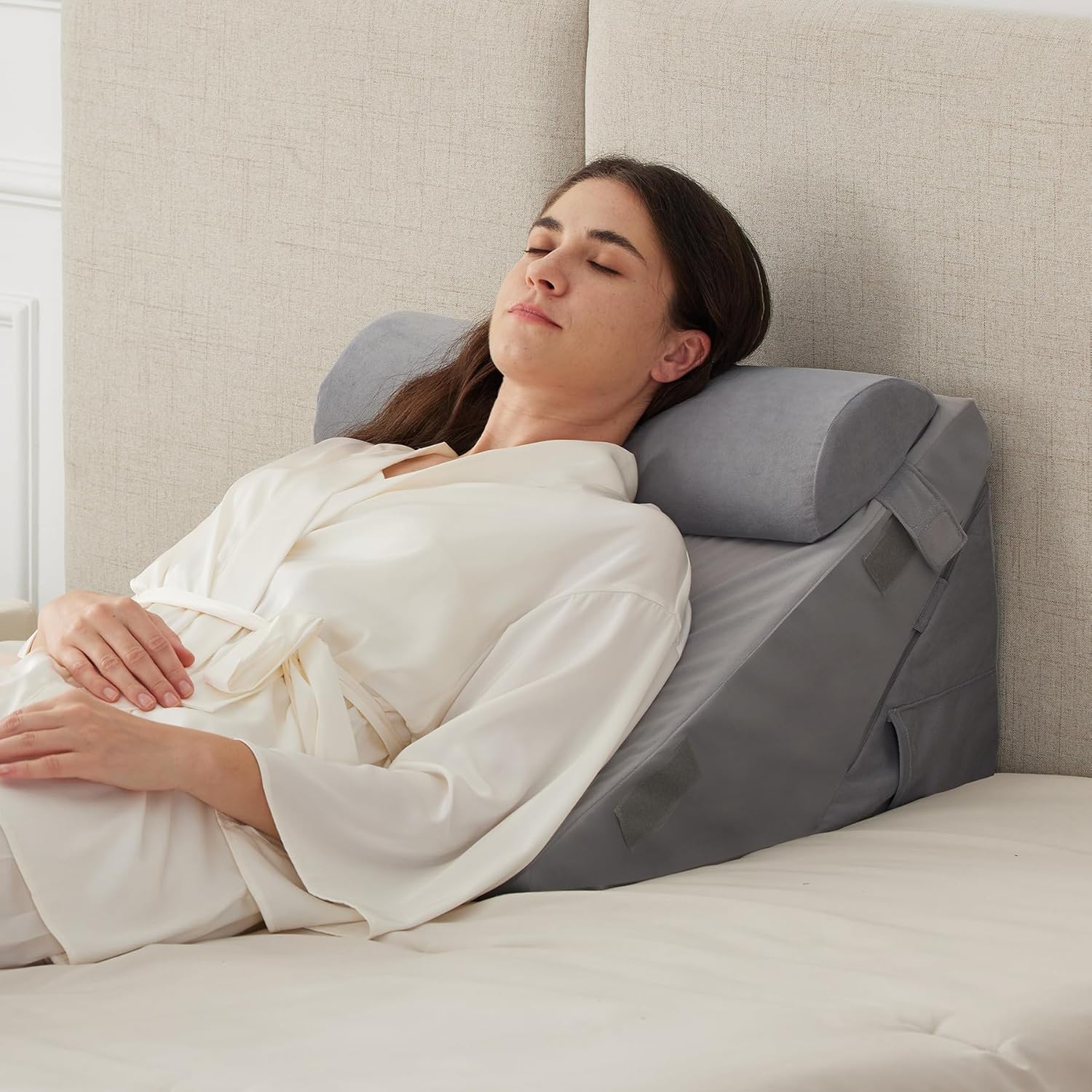 CUSHIO Adjustable Memory Foam Wedge Pillow with Headrest for Back Support, 12-in-1 Versatile Design for Sleeping, Leg Elevation Support (Grey)