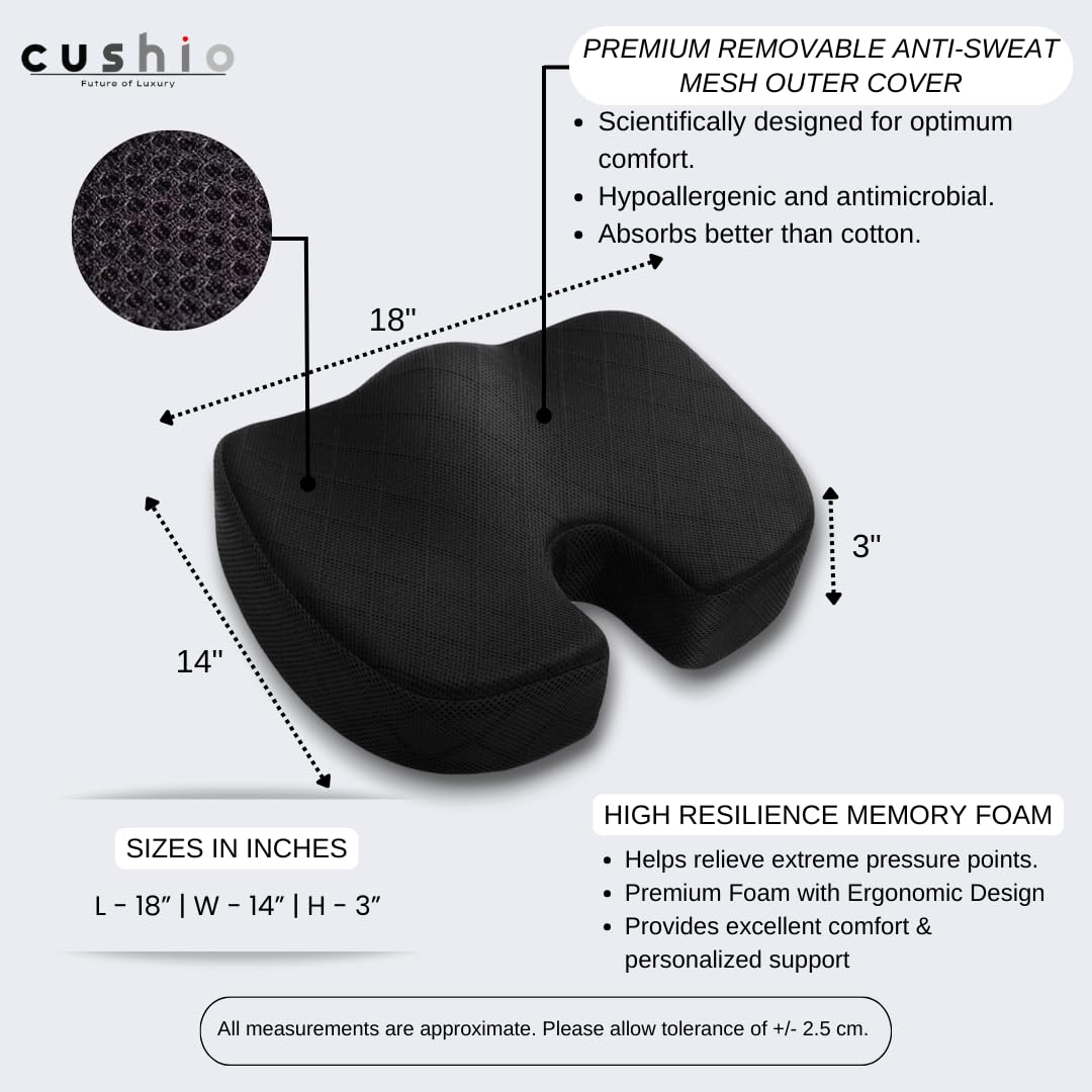 CUSHIO Coccyx Seat Cushion (High Density) for Tailbone, Sciatica, Hip Lower Back Pain Relief | Memory Foam Cushion for Office or Home Chairs or Wheelchairs (Upto 120KG, Black)