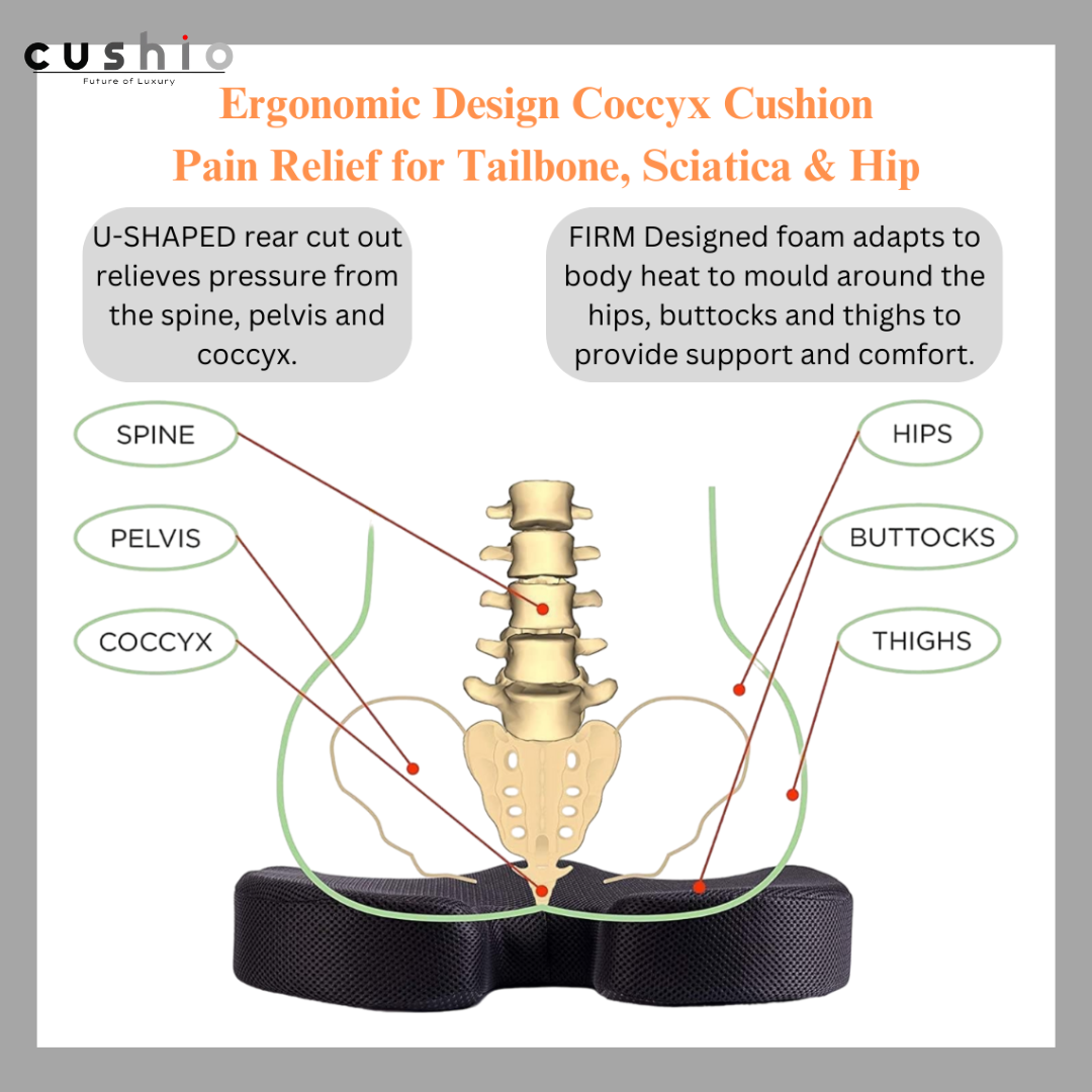 • Tailbone Pain Relief: Designed with a coccyx cutout, our cushion helps alleviate pressure on the tailbone, making it ideal for individuals suffering from coccydynia, tailbone injuries, or discomfort during pregnancy. Experience relief and comfort with every sit.